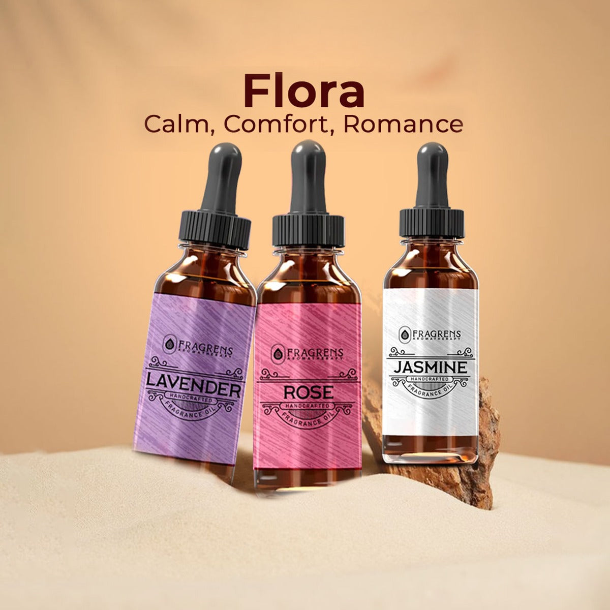 Flora is a delicate trio of timeless floral essential oils — Rose, Jasmine, and Lavender — each capturing a different expression of beauty, calm, and emotional well-being.